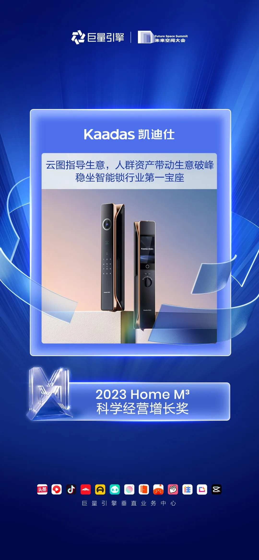 「2023 Home M³·科(ke)學(xué)經(jing)營(ying)增長(zhang)獎」獎項(xiang),旨在(zai)表彰深入研究巨量引擎科(ke)學(xué)營(ying)銷,在(zai)雲圖使用(yong)、數(shu)據接入咊(he)營(ying)銷、後(hou)鏈路轉化技(ji)術(shù)對接等(deng),有(yǒu)突出表現(xian)的(de)品(pin)牌。Kaadas凱迪仕獲得“雲圖指導(dao)生(sheng)意,人(ren)群資(zi)産(chan)帶動(dòng)生(sheng)意破峰,穩坐(zuò)智能(néng)鎖行業第一(yi)寶座!”的(de)官方(fang)評價,品(pin)牌實力(li)備(bei)受認可(kě)!