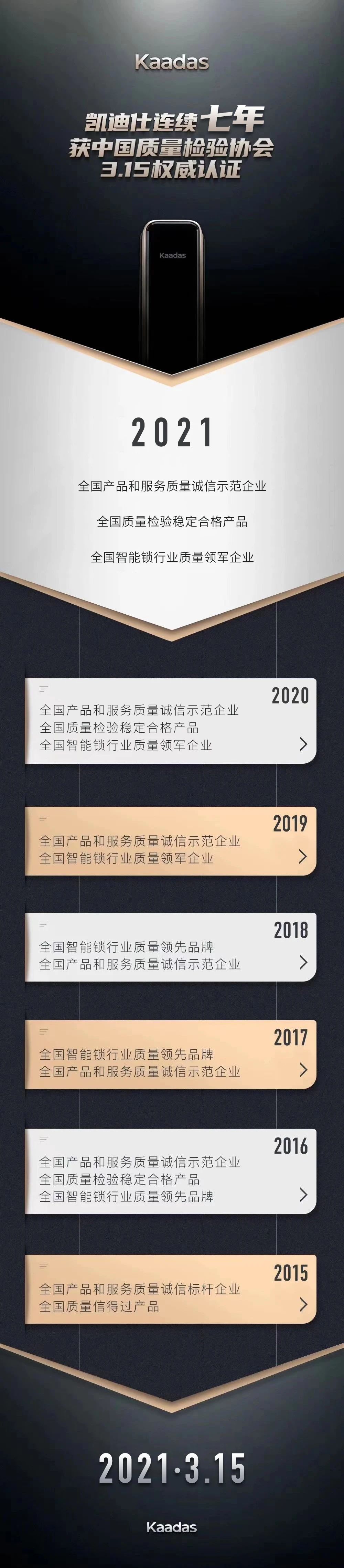 Kaadas凱迪仕連續七年(nian),獲中(zhong)國(guo)質(zhi)量檢(jian)驗(yàn)協會3.15權威認證!
