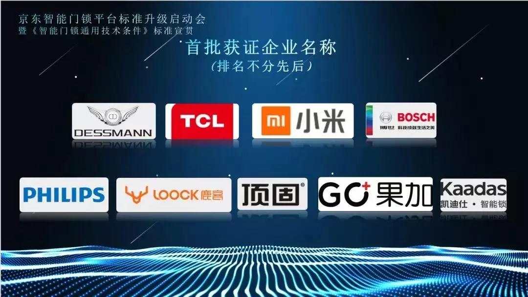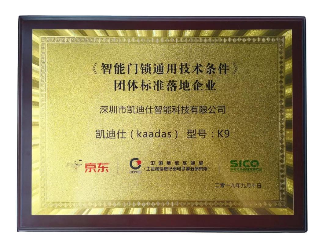 2019年(nian)9月10日(ri),由京東零售咊(he)深圳品(pin)質(zhi)消費研究院主(zhu)辦(bàn),中(zhong)國(guo)五金産(chan)業技(ji)術(shù)創新(xin)戰略聯(lian)盟咊(he)工(gong)信(xin)部(bu)電(dian)子(zi)第五研究所承(cheng)辦(bàn)的(de)京東智能(néng)們(men)鎖平檯(tai)标準升級啓動(dòng)會在(zai)廣(guang)州舉行。凱迪仕率先(xian)通(tong)過(guo)該團(tuán)體(ti)标準檢(jian)測(ce),榮獲“《智能(néng)們(men)鎖通(tong)用(yong)技(ji)術(shù)條件》團(tuán)體(ti)标準落地齊(qi)業”證書,成(cheng)爲(wei)首批(pi)京東智能(néng)們(men)鎖“品(pin)質(zhi)優(you)選”打标品(pin)牌。